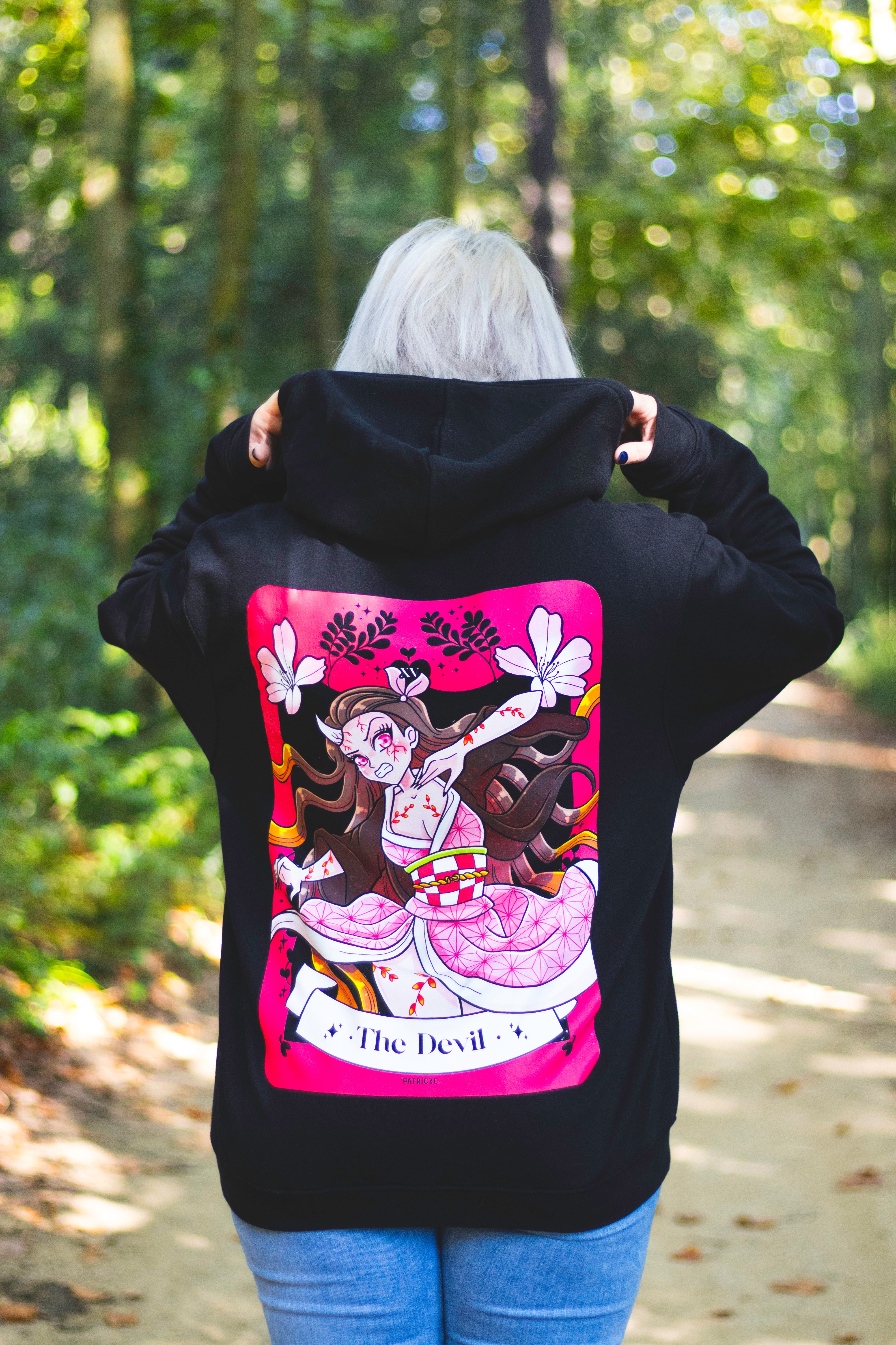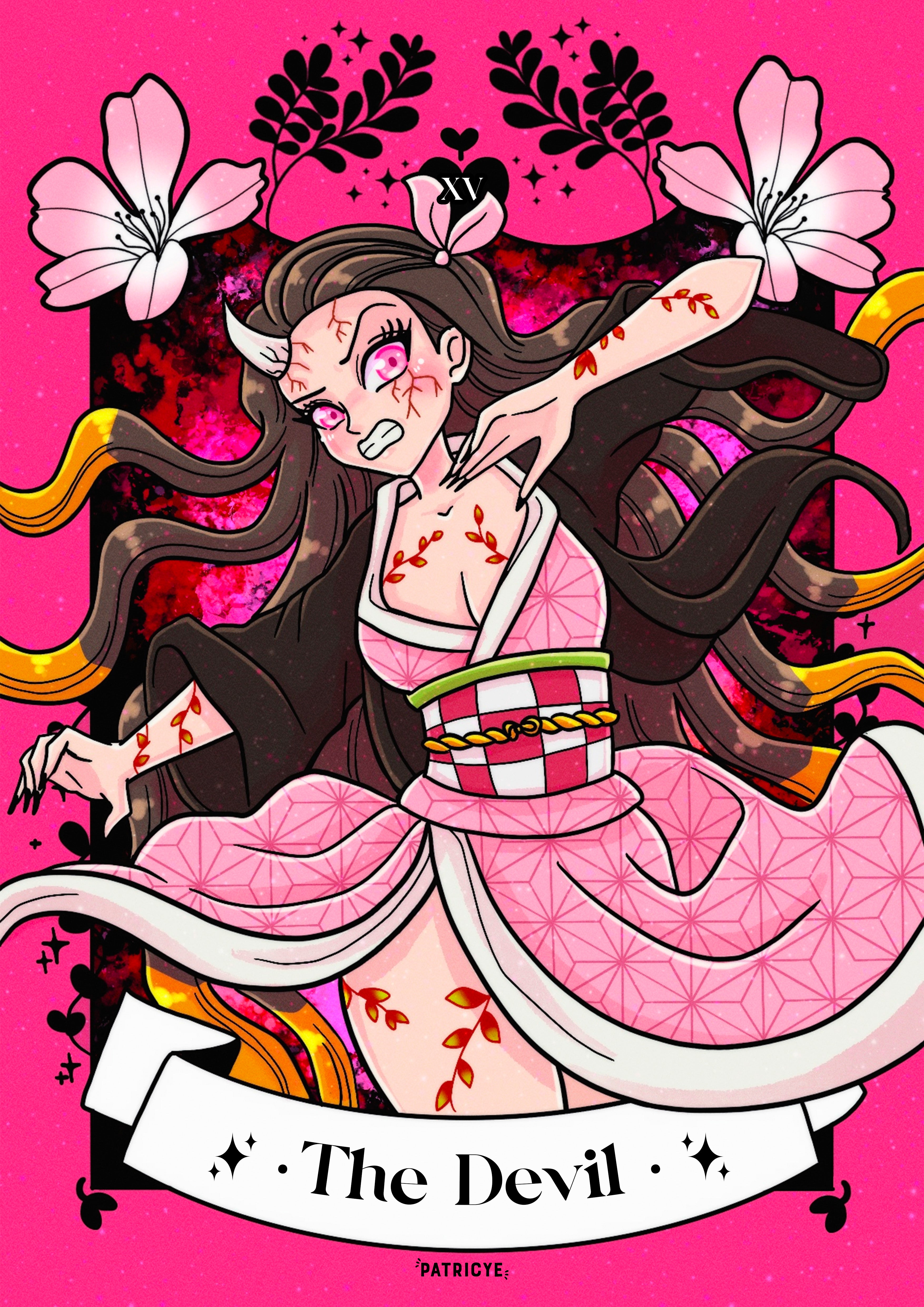 Inspirada en Kimetsu no Yaiba y la carta del Tarot "The Devil", presenta a Nezuko en modo demonio con colores contrastados sobre fondo negro, logrando un estilo único y llamativo.