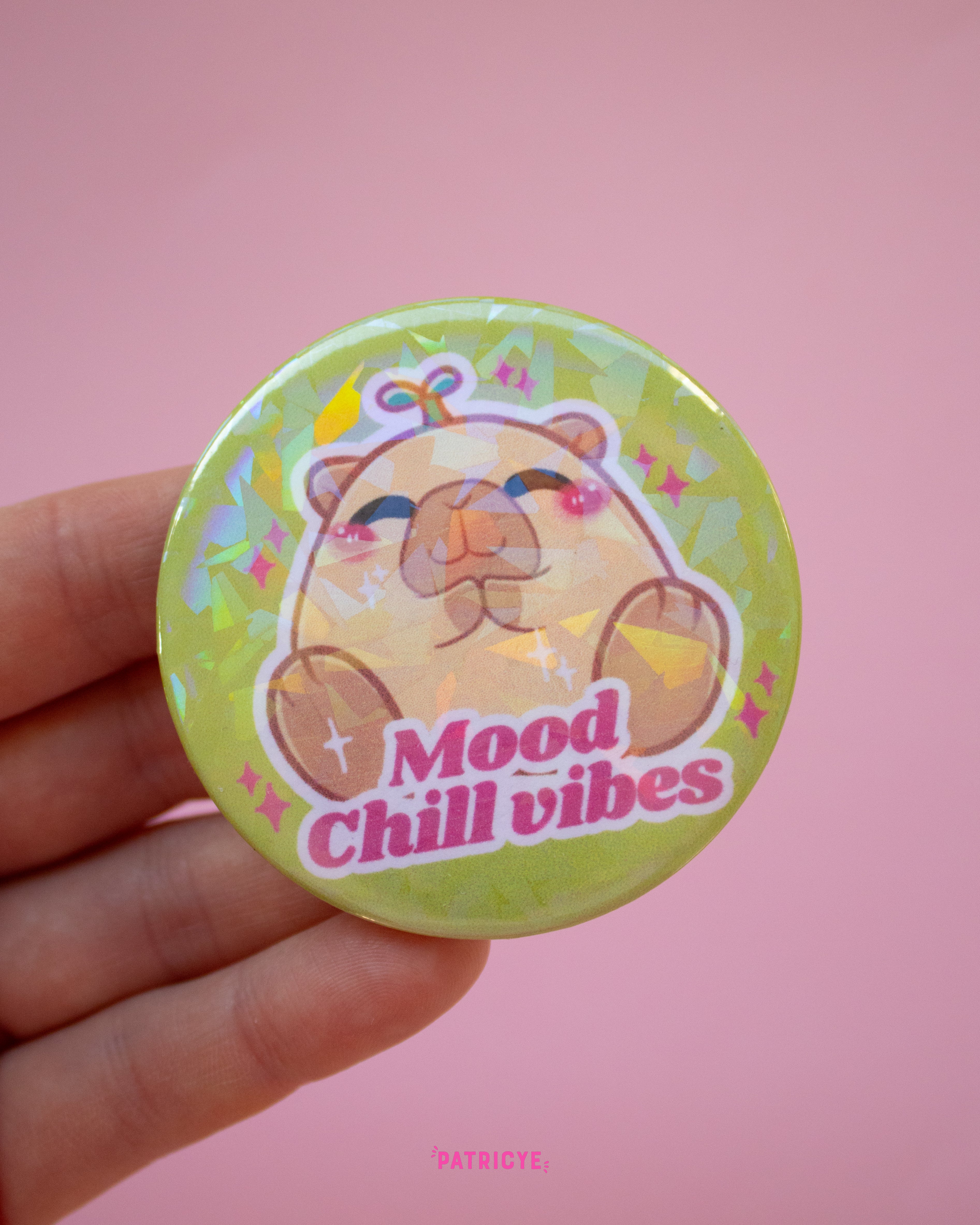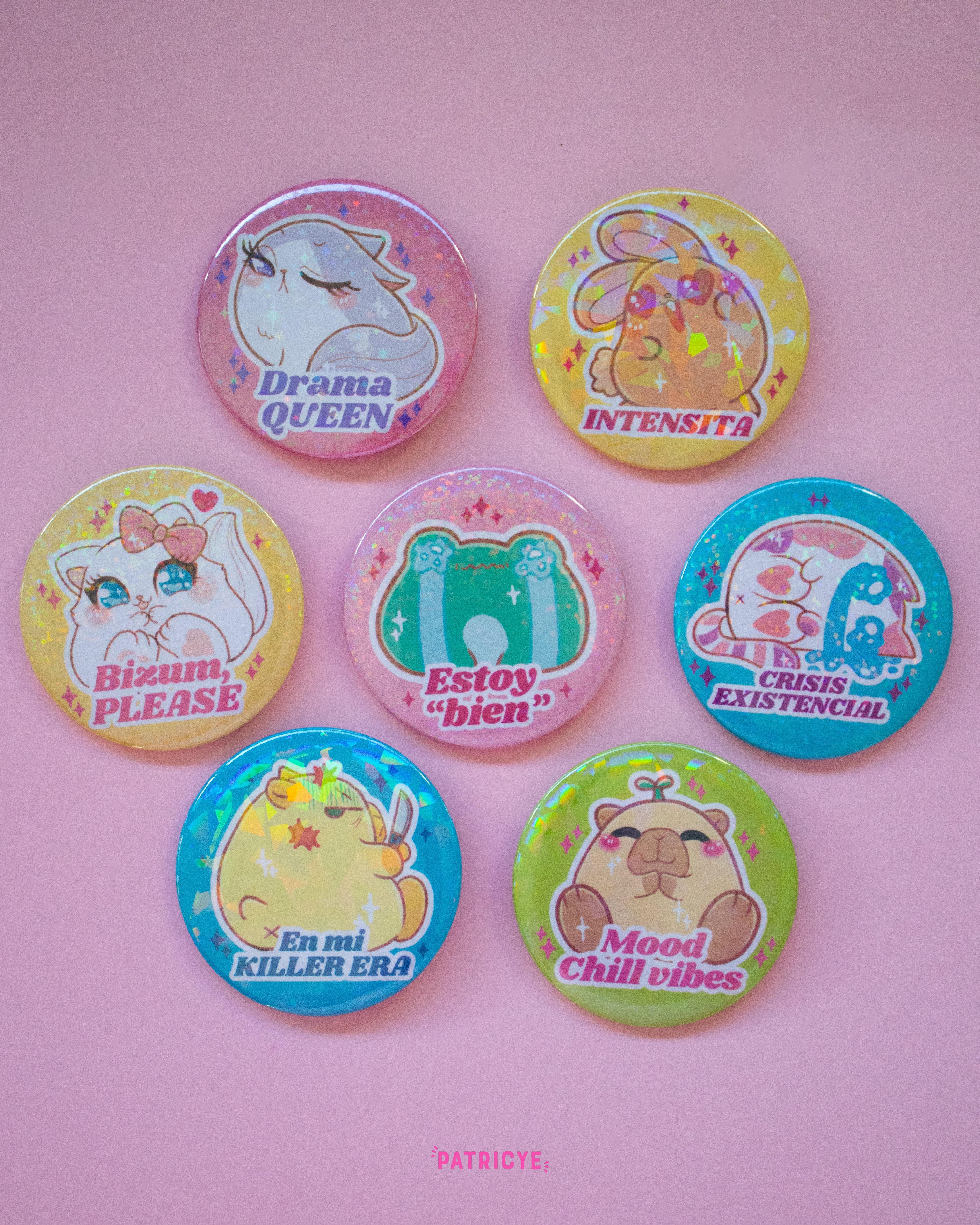 Chapas con acabado holográfico con varios moods y personajes de lo más adorables.