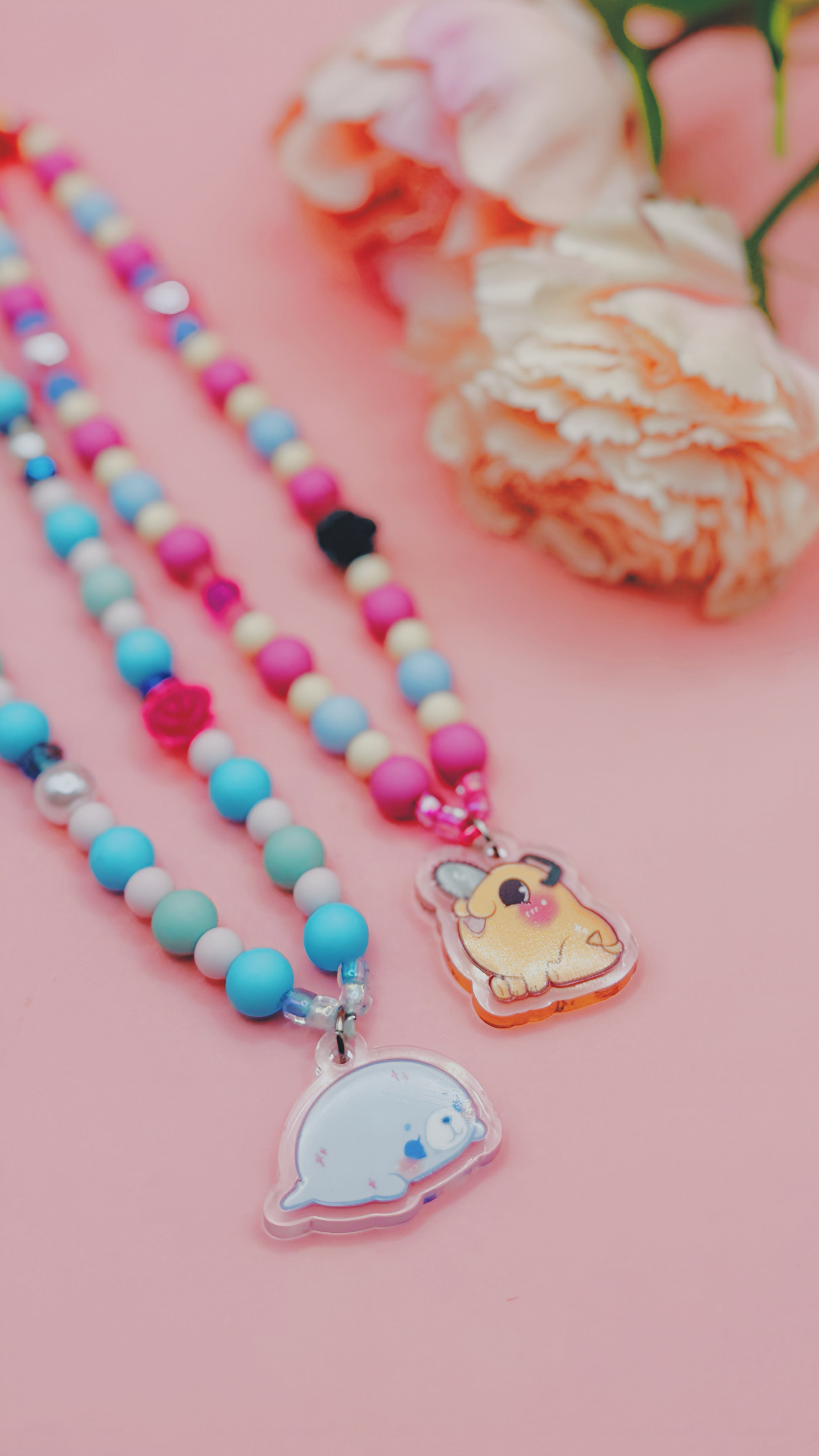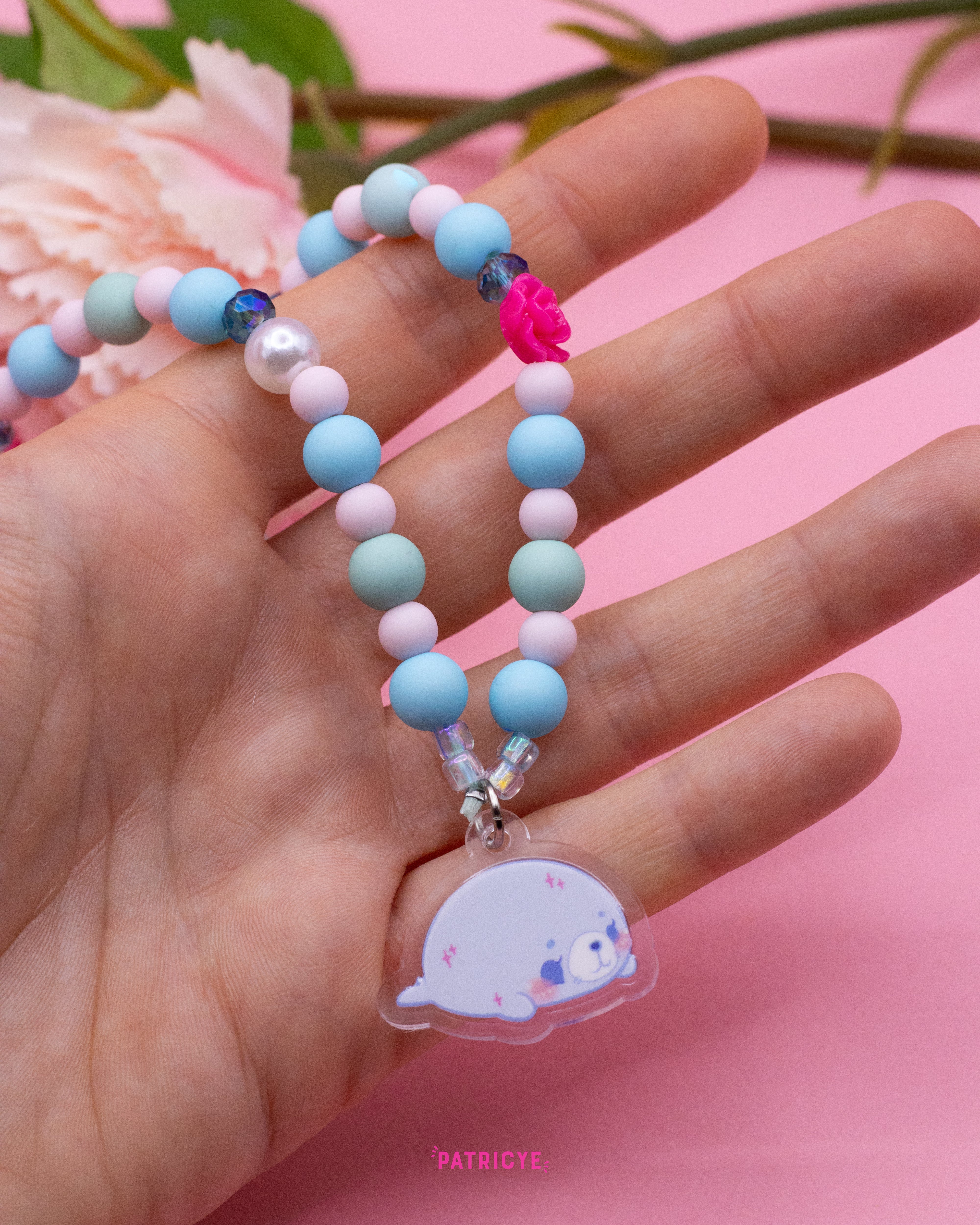 Cuelgamóvil hecho a mano con abalorios de colores azules, turquesas y malvas. Se coloca en los huecos de las carcasas de los móviles :)