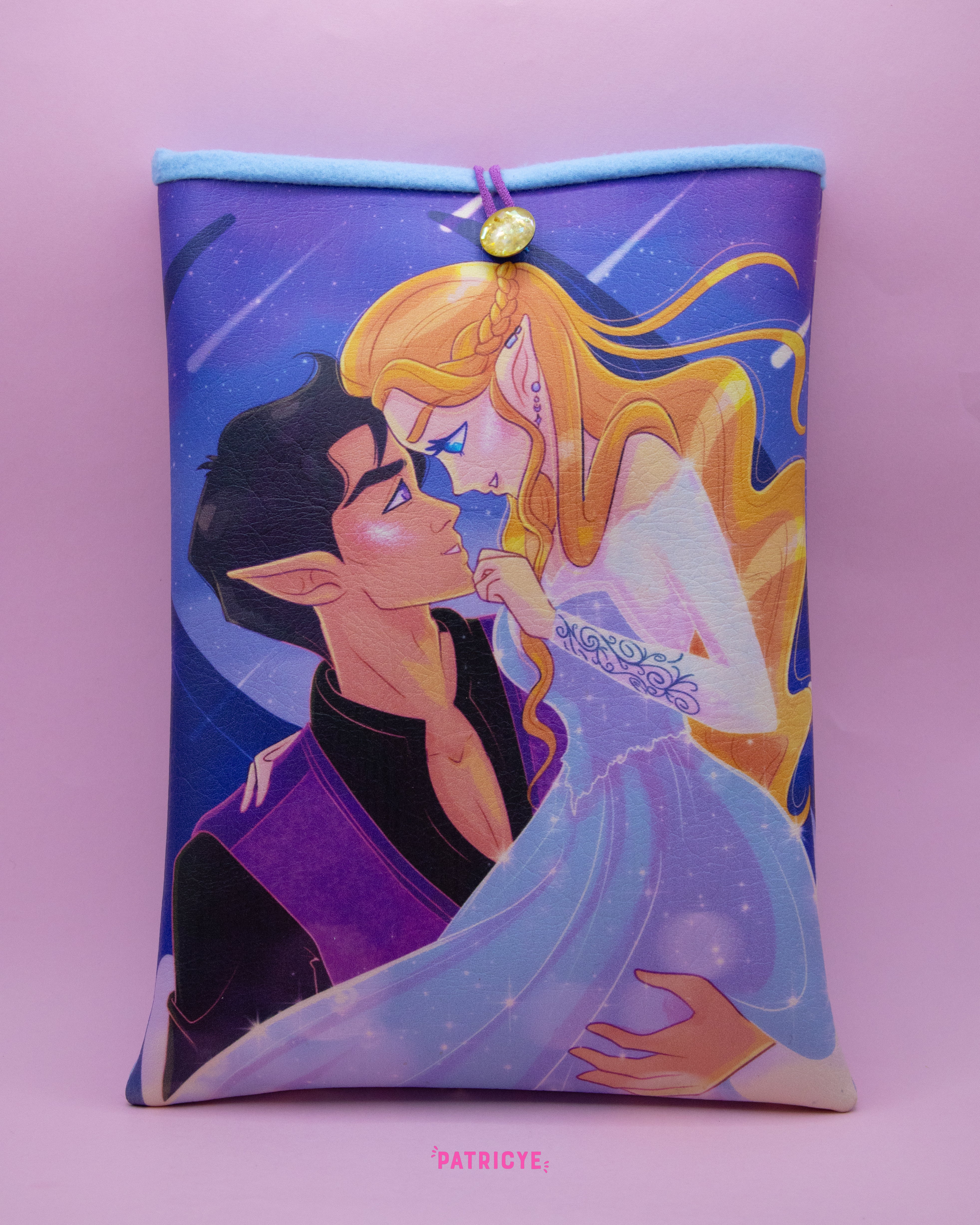 Feyre y Rhysand protagonizan la portada, inmortalizados en un momento que define su conexión. En la parte trasera, descubre un estampado envolvente lleno de detalles inspirados en la serie: alas etéreas, runas antiguas, flores de medianoche y símbolos de poder que evocan cada giro emocionante de la trama.