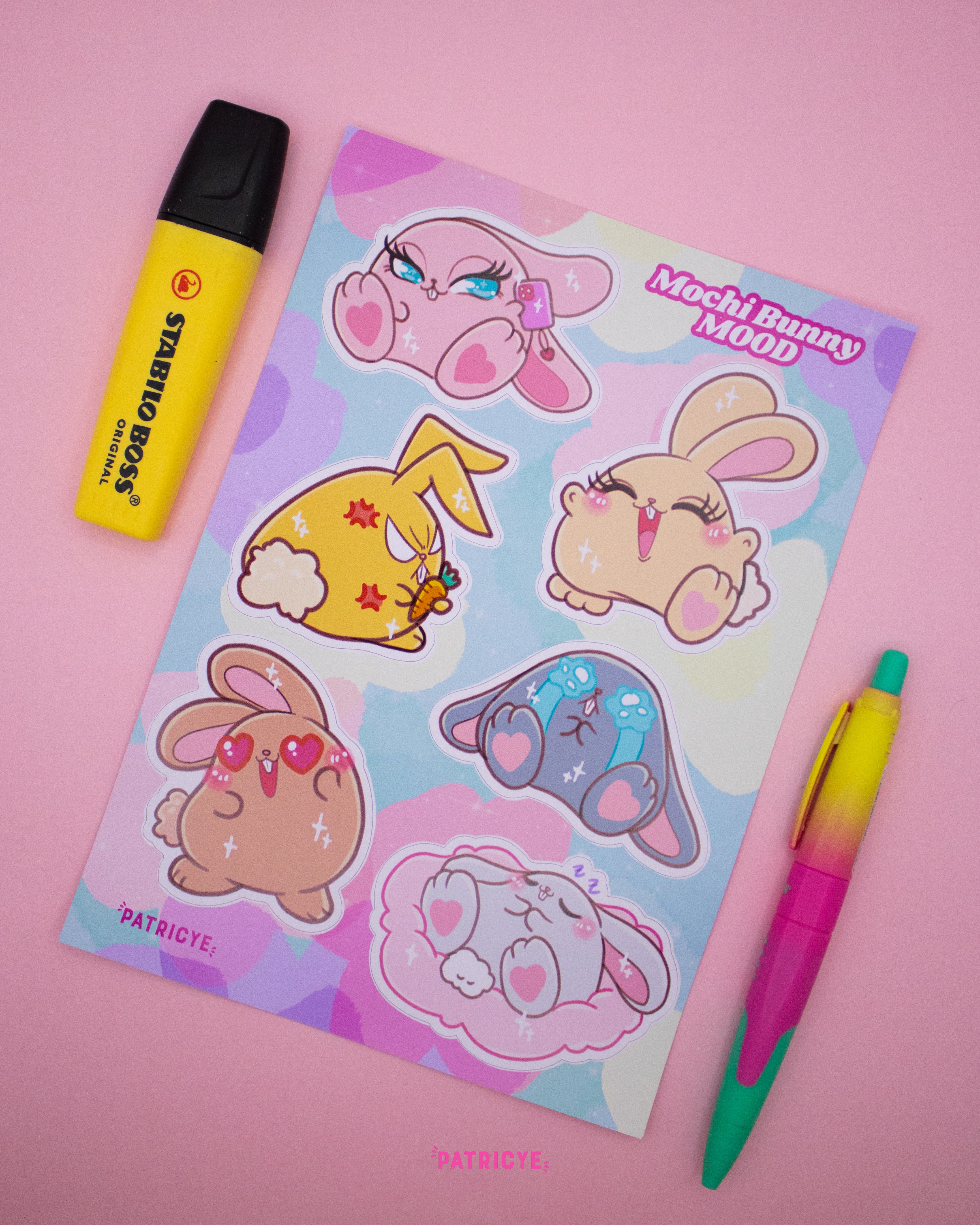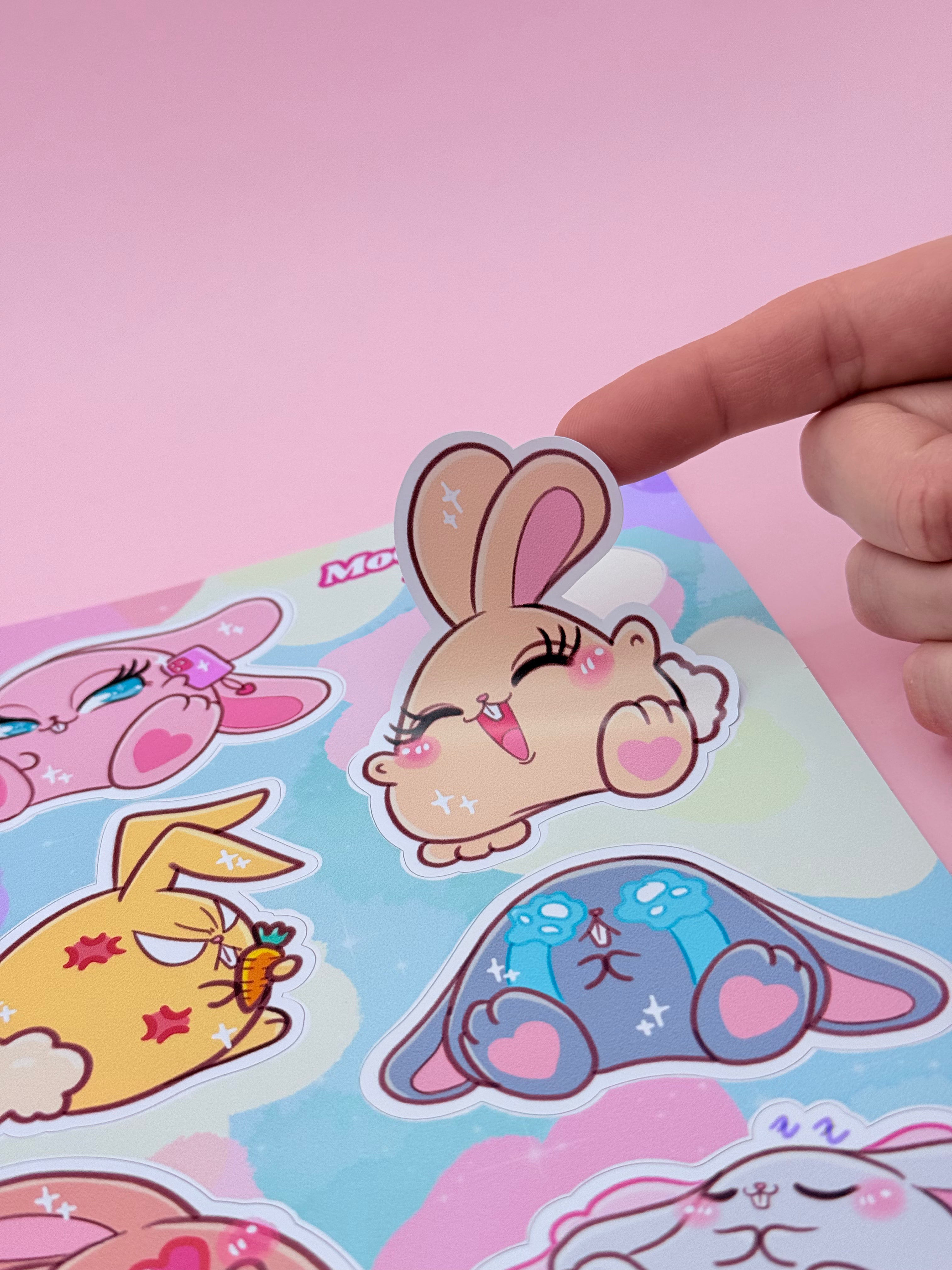 Esta hoja contiene seis stickers de vinilo con conejitos adorables en sus diferentes moods. Perfectos para personalizar tu portátil, botella o agenda con estilo.