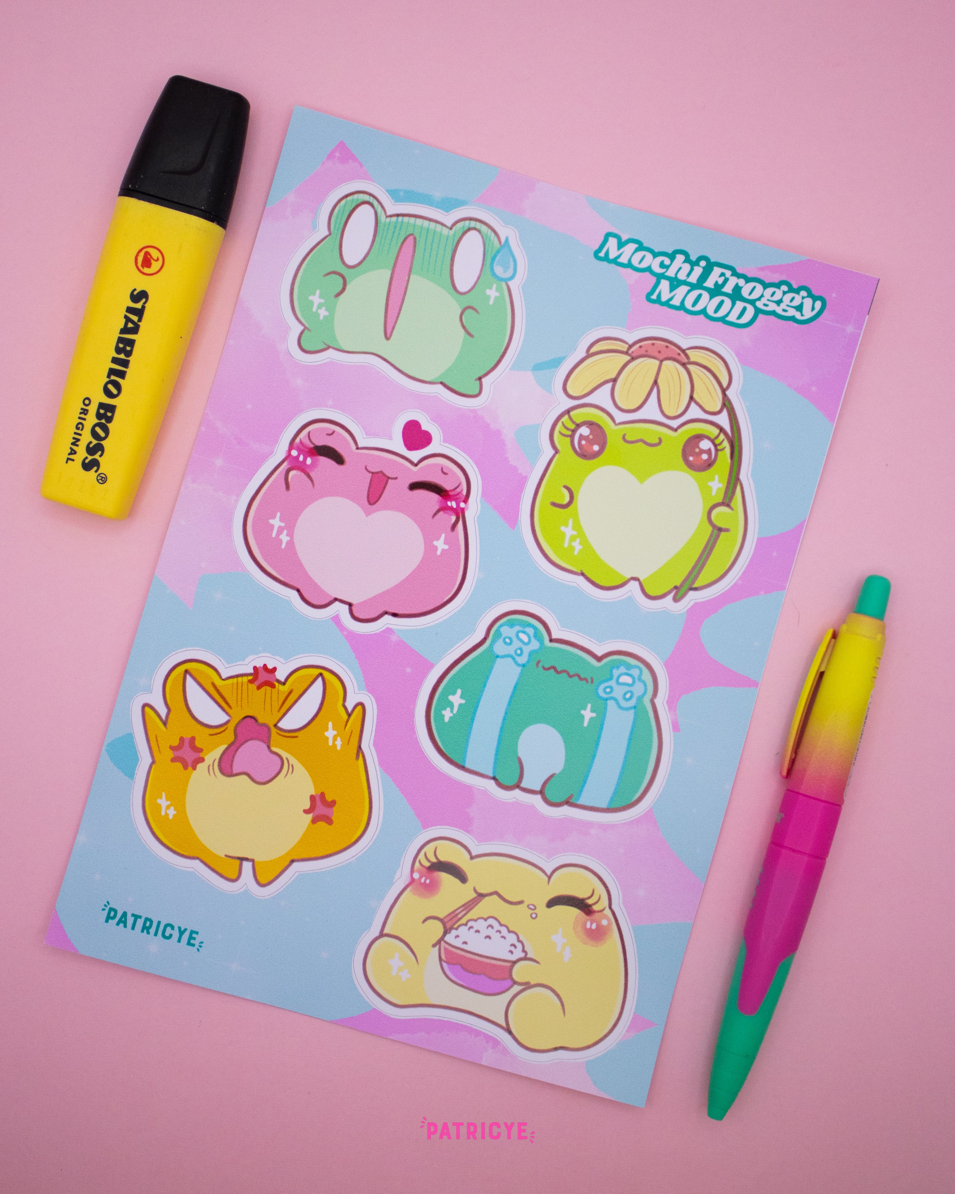 Esta hoja contiene seis stickers de vinilo con ranitas adorables en sus diferentes moods. Perfectos para personalizar tu portátil, botella o agenda con estilo.