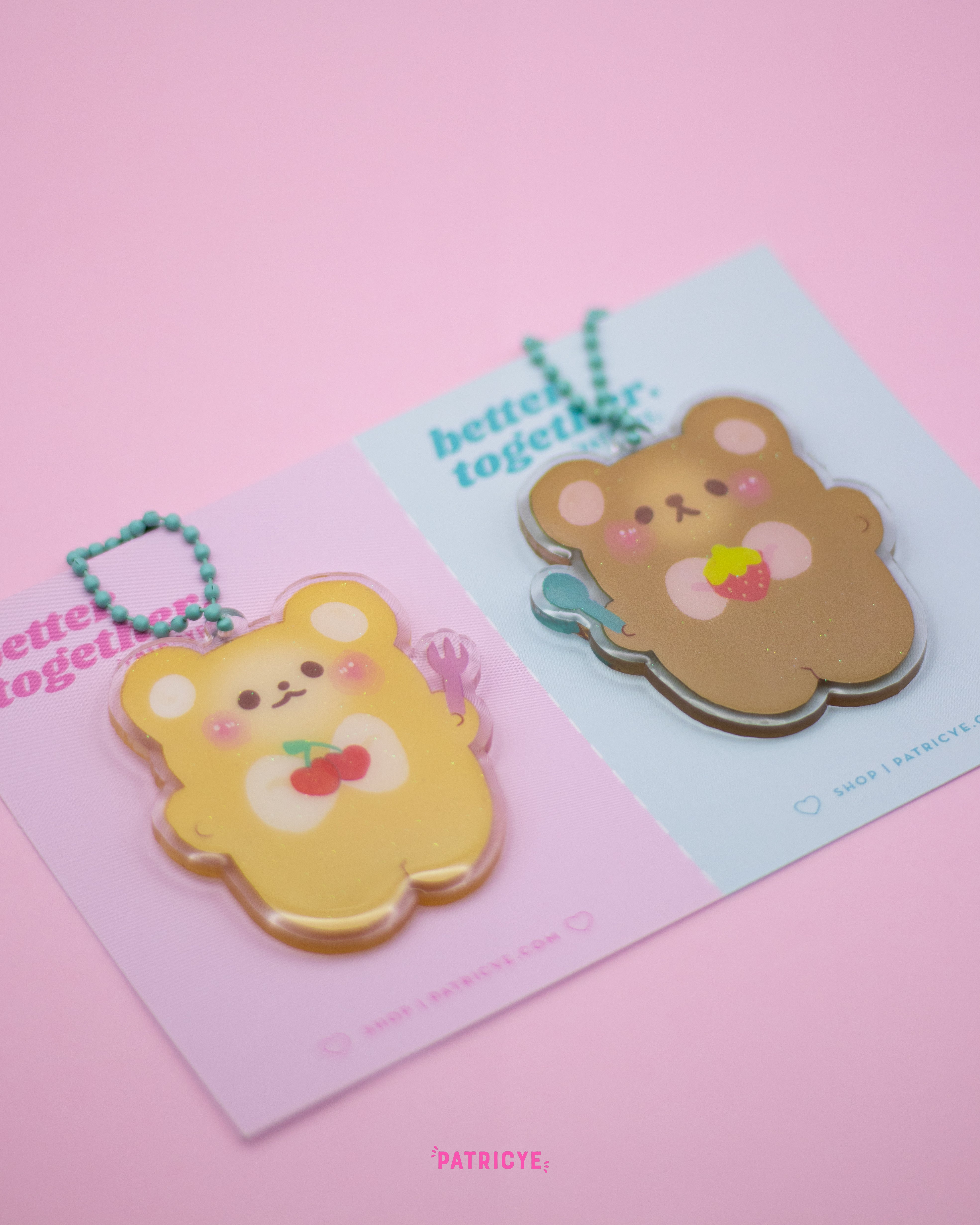 Estos adorables llaveros cuentan con un diseño reversible y acabado epoxy glitter que brilla con cada movimiento, capturando la luz de forma irresistible. Ideales para parejas, amigas o hermanos, cada pieza refleja ternura y estilo.