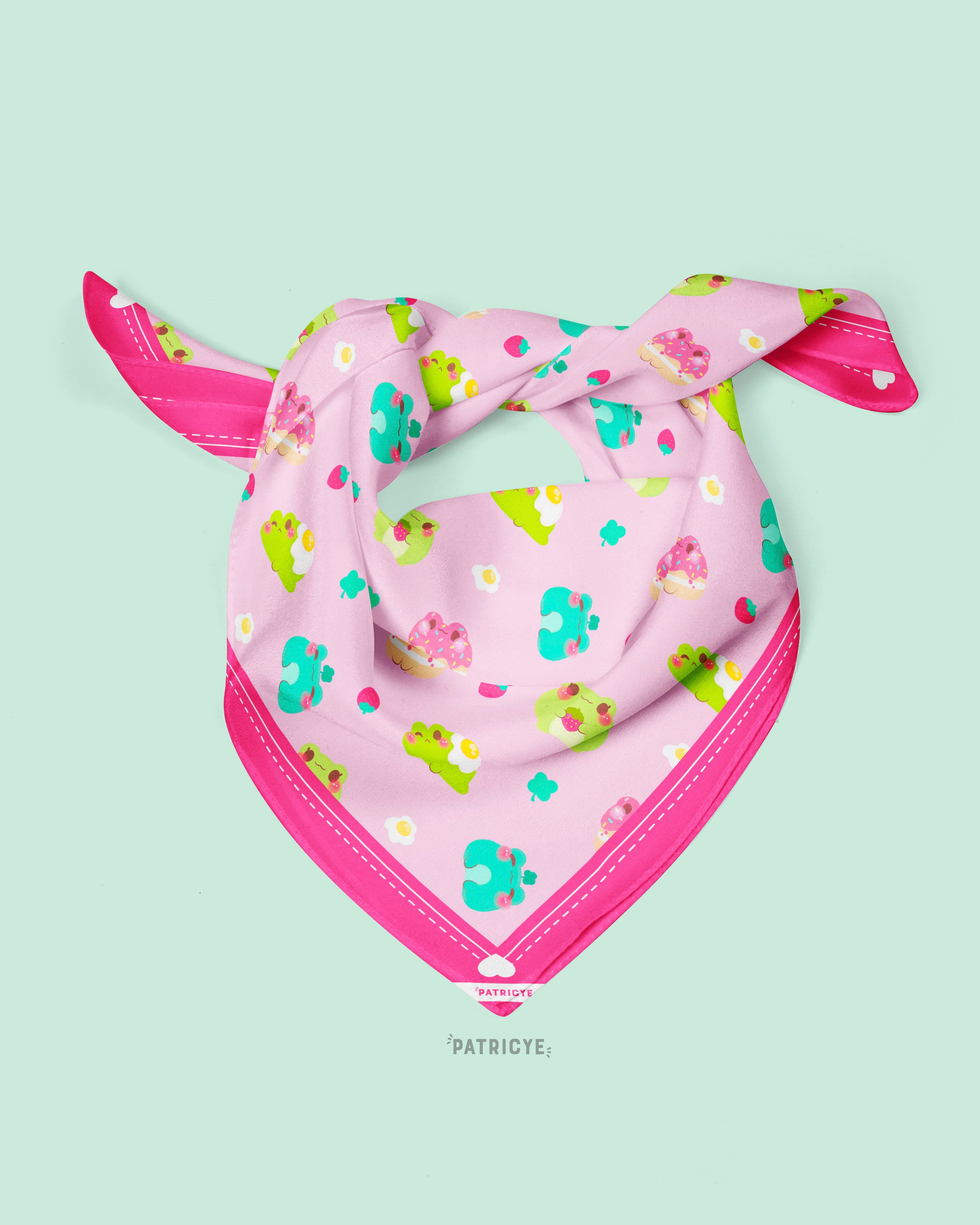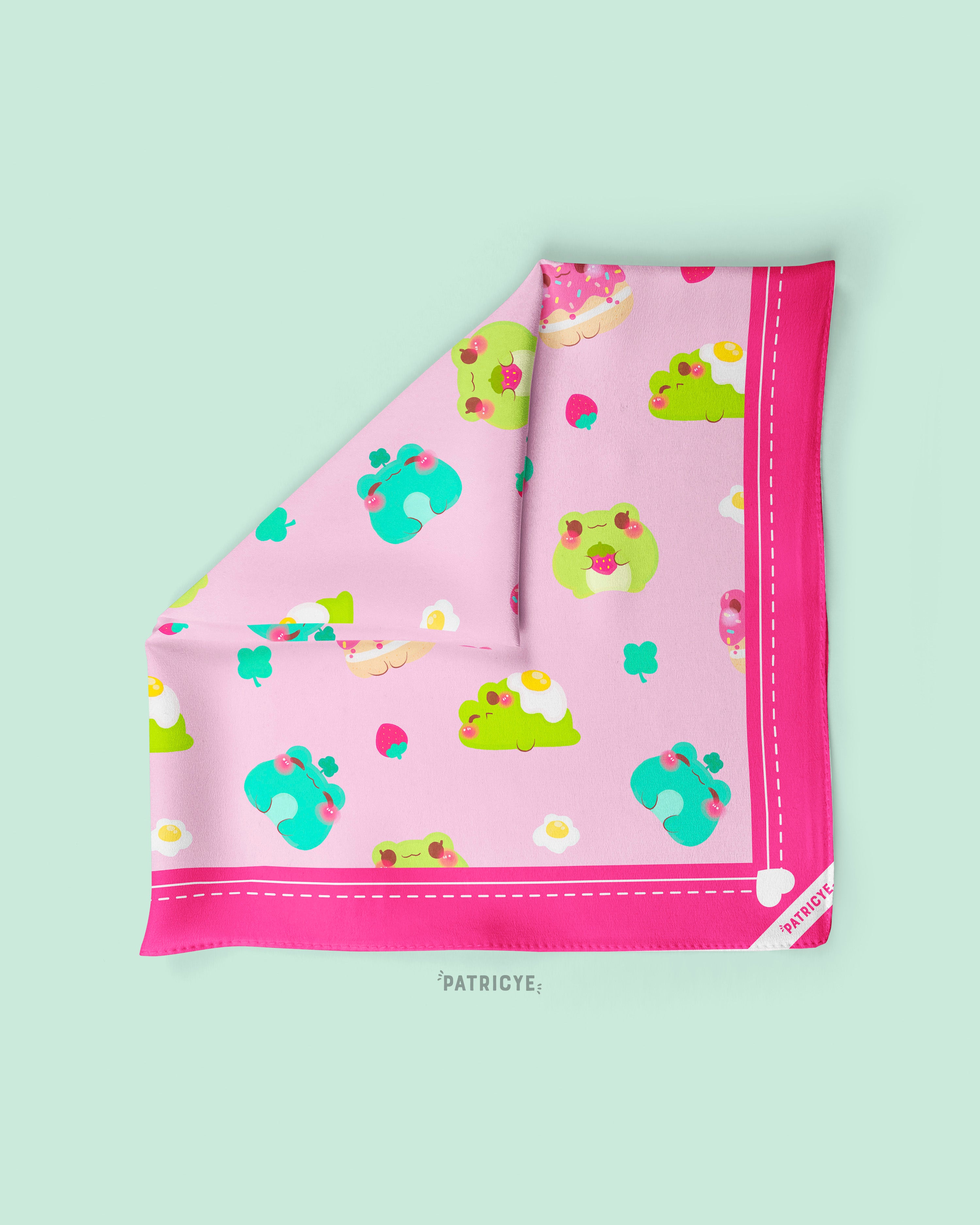 Descubre nuestro encantador pañuelo de semiseda con adorables ranitas kawaii estampadas.