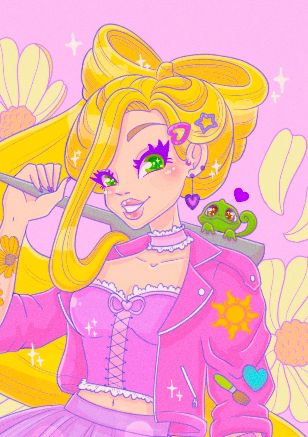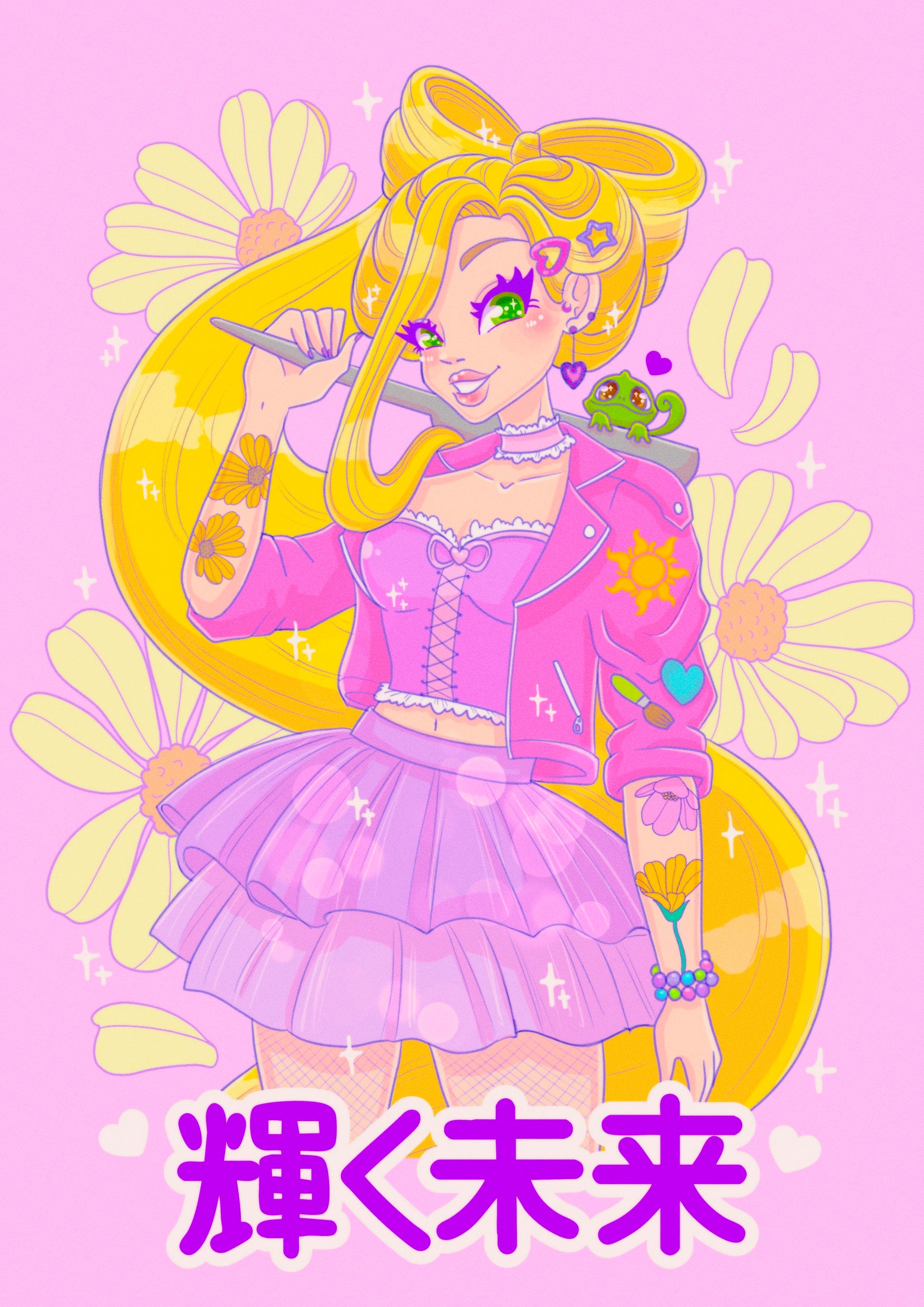 Ilustración basada en Rapunzel con un estilo japonés del barrio de Harajuku.